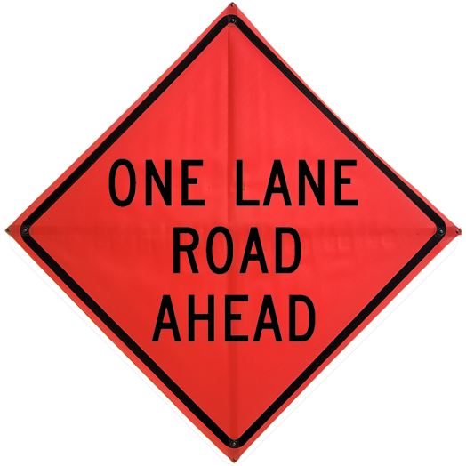 48″ X 48″ NON-REFLECTIVE VINYL MESH ROLL-UP SIGNS WITH HEAVY DUTY FRAME (ONE LANE ROAD AHEAD)