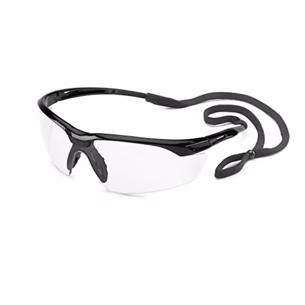 CONQUEROR CLEAR LENS WITH SPORTY BLACK FRAMES AND RETAINER CORD, 10 PAIR PER BOX