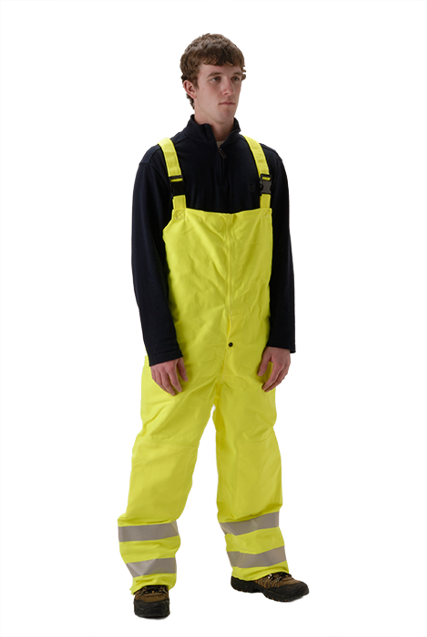 Fluorescent yellow bib style trouser with snap fly front, quick release suspender self-material system, Klein Tool pocket on right thigh, reinforced knees, non-conductive leg zippers with overfly, 3M Scotchlite 2″ reflective trim at calf and ankles, IN SIZE 2XL