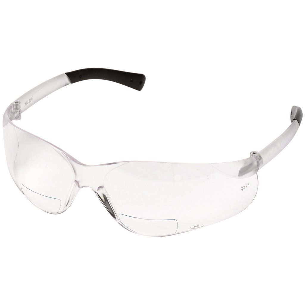 BEARKAT CLEAR LENS SAFETY GLASS WITH RUBBER TEMPLE TIPS AND 2.0 DIOPTER, 12 PAIR PER BOX