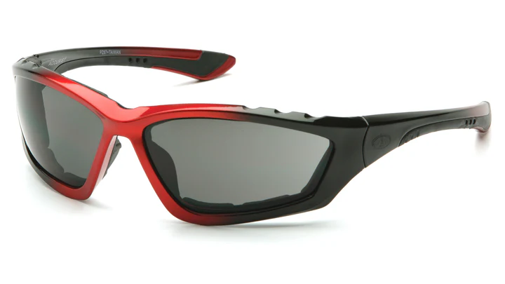 ACCURIST SAFETY GLASS WITH GRAY ANTI-FOG LENS, FOAM PADDED, WITH BLACK/RED FRAME, 12-PAIR PER BOX
