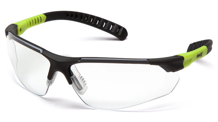 SITECORE CLEAR LENS SAFETY GLASSES WITH FLEXIBLE, VENTILATED, & RATCHETING TEMPLES. GRAY AND LIME FRAME, 12 PAIR PER BOX